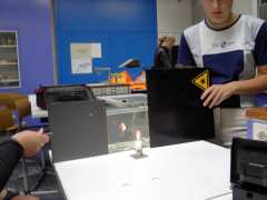 Wir stellten das Gefäß parallel zur Tischkante des Betrachters, nun wurde die Kerze nicht mehr an den Seitenwänden gespiegelt. Nun konnte man jedoch nicht die gesamte Kerze betrachten, da die Oberfläche des Wassers nun zu schmal war. Es wurde ein breiteres Gefäß genommen und die gesamte Kerze war deutlich zu sehen. Nun hatten wir eine hochqualitative Luftspiegelung: